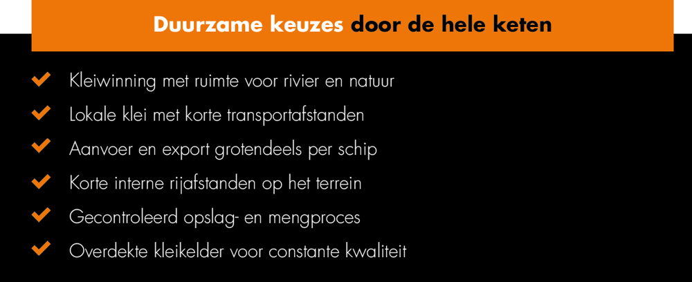 Voor het productieproces maken we gebruik van lokale klei, waardoor transportafstanden beperkt blijven. De aanvoer verloopt grotendeels per schip naar onze fabriek in Aalst, hetgeen met ca. 110 schepen per jaar zorgt voor een aanzienlijke reductie van CO₂-uitstoot ten opzichte van wegtransport.